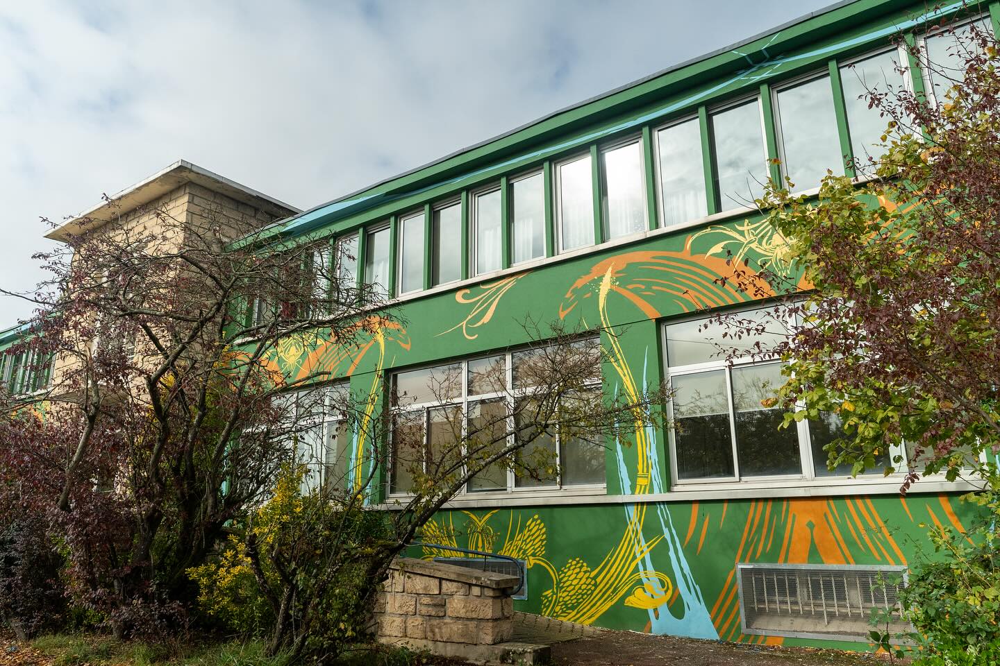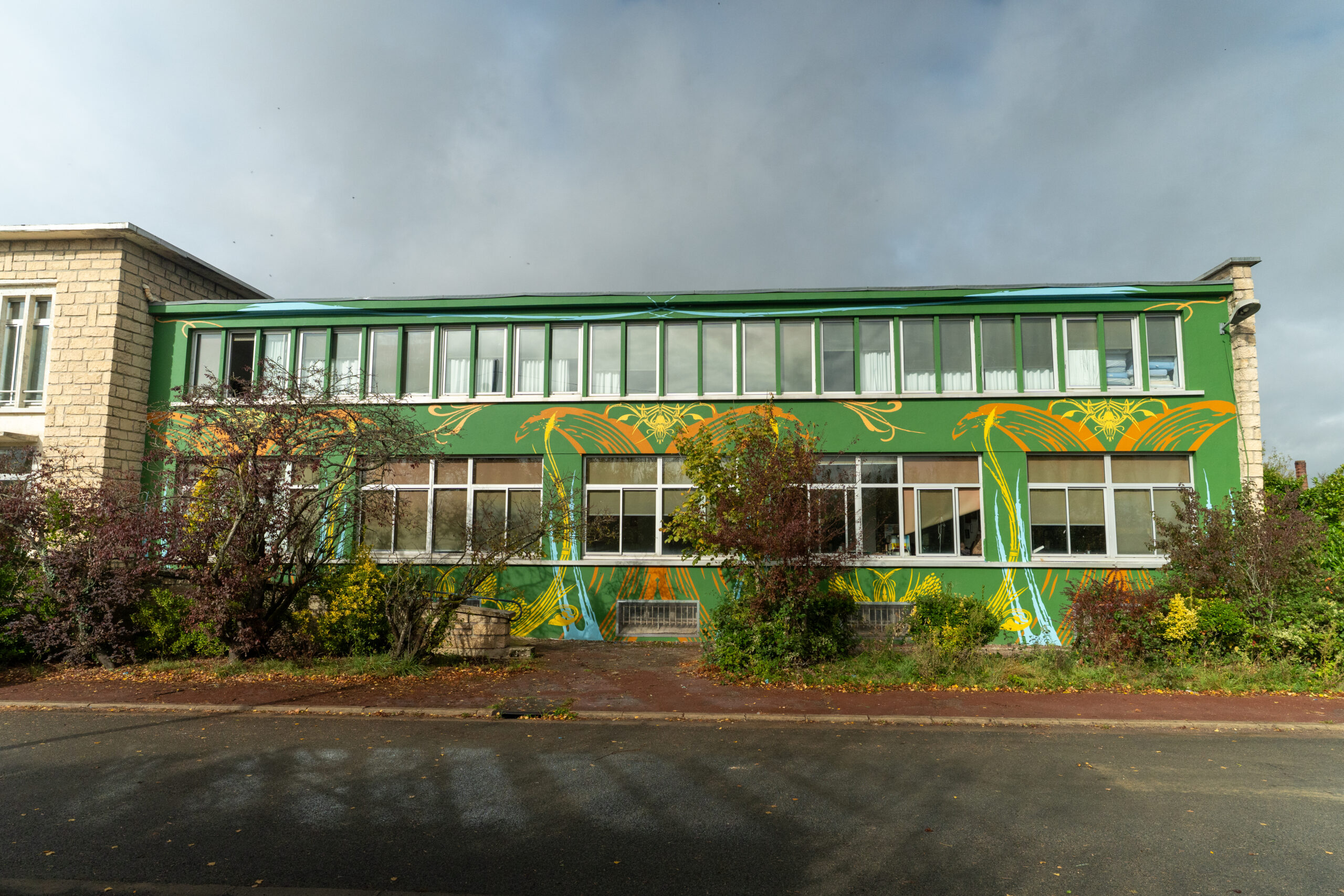 3 semaines intenses et un défi technique de taille pour donner une nouvelle vie à cet ancien édifice militaire de 60 mètres de long sur 8 mètres de haut. L’œuvre emprunte ses couleurs à celles que l’on retrouve dans la nature environnante et aux courbes organiques des végétaux.