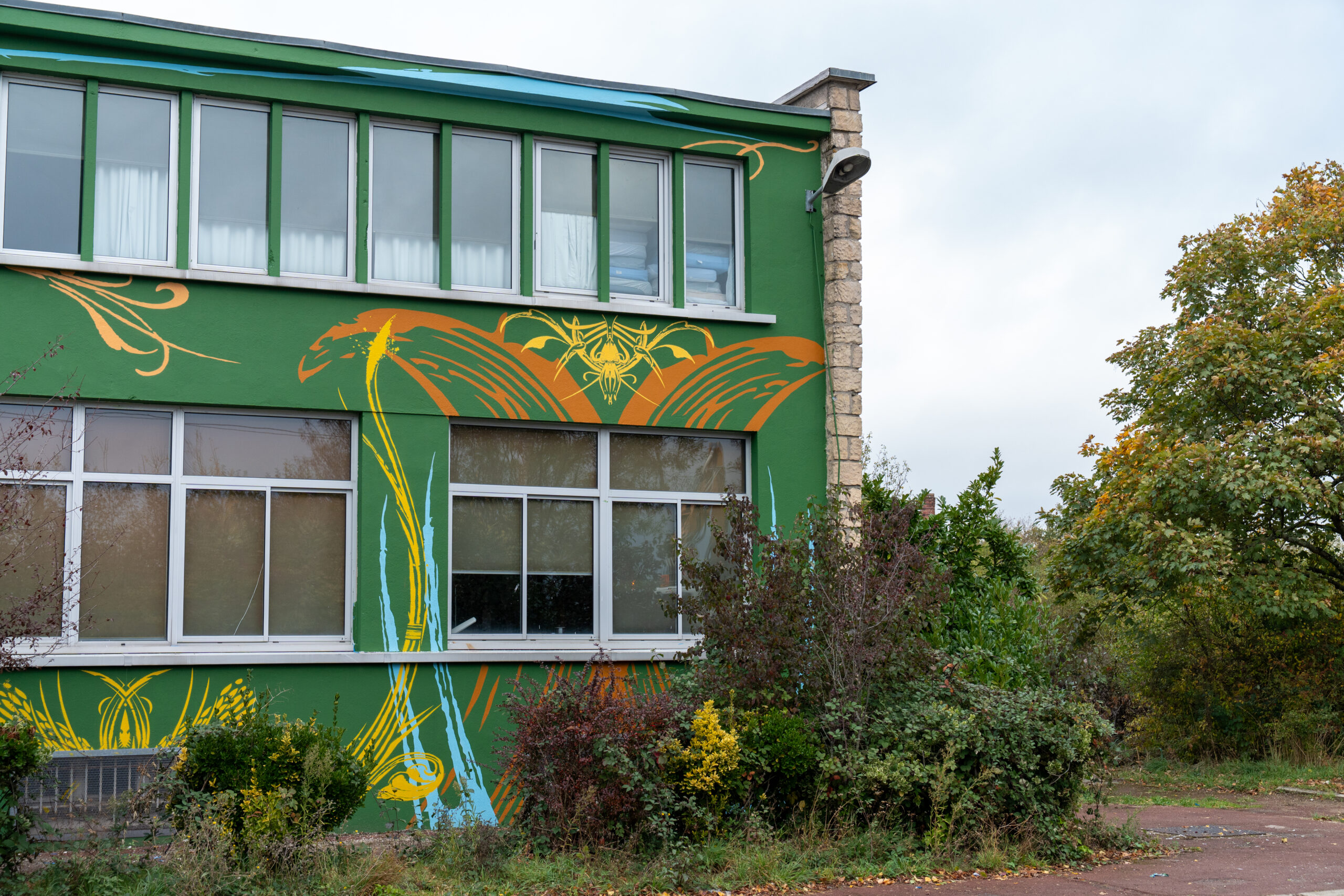 L’ancienne base aérienne 217 située à Bretigny-sur-Orge invite l’artiste Ned pour imaginer une immense fresque sur la façade du bâtiment Chalard.